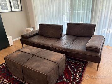 260 x 130 x 80 Divano scenico in CuoioNabuk marrone con cuciture a vista vintage di Gobbo Salotti come in foto. Particolare x arredamento moderno. Seduta regolabile più o meno profonda. Usufruibile anche come comodo letto. 2300 euro. Se interessati pouf uguale di grandi dimensioni. Vendo x cambio casa.