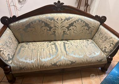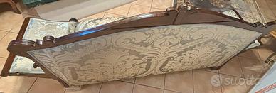 Vendesi divano d’antoquariato d’epoca inglese in noce e tessuto di seta damascato, da 2-3 posti.