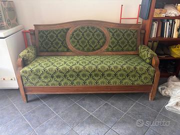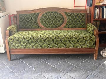 Tipico Divano ottomana anni 50. Telaio in legno, seduta e schienale imbottiti, colore verde, come da foto. Misure: Lunghezza 1.80, Altezza dello schienale 90, Altezza seduta 55, Profondità 75. Ritiro in loco.
