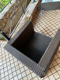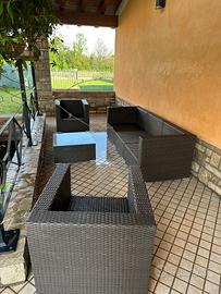 Divano tre posti più tavolino e poltrone in polyrattan, comprensivo di cuscinoni bianchi sfoderabili