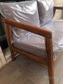 Vendo divano 2 posti in legno di acacia finitura ad olio, compreso di cuscini in tessuto idrorepellente. Misura: 116x 71 x77 (h) cm.