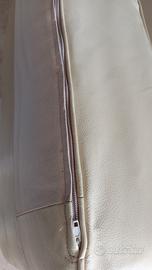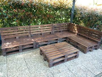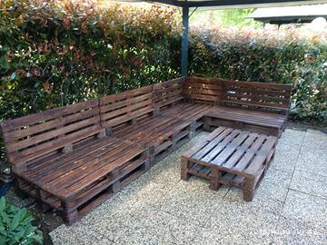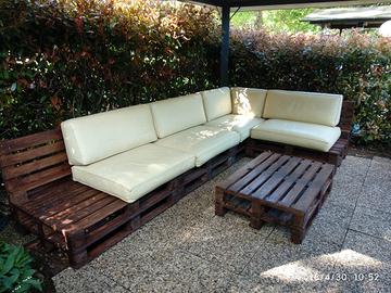 Vendo divano con struttura in pallet trattati e cuscini in vera pelle. 4 elementi da 114 cm per 80 cm combinabili a piacere. Nella foto combinazione ad L metri 3,4 x 2.
