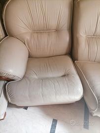 Divano in pelle, 4 posti, color ghiaccio, si possono staccare i pezzi. I cuscini poco rovinati, lo schienale intatto.