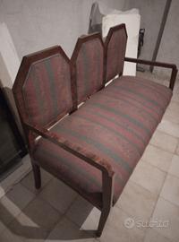Divano Art Deco tre posti in radica di noce, in perfette condizioni, comodo ed elegante, facente parte di un salotto (3 pezzi) in stile moderno per l'epoca, quindi molto attuale ed inseribile. La tappezzeria può essere (a richiesta) personalizzata. Viene proposto in blocco con le poltrone. Per info 3406203846