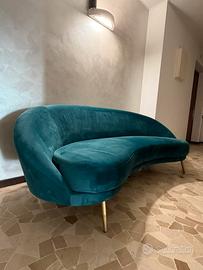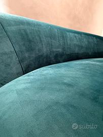 Elegante divano di design dalla forma curva, un vero pezzo iconico capace di valorizzare qualsiasi ambiente. Rivestito in velluto verde petrolio, raffinato e di grande impatto visivo, unisce comfort ed estetica contemporanea.