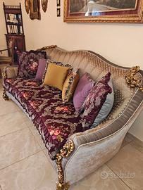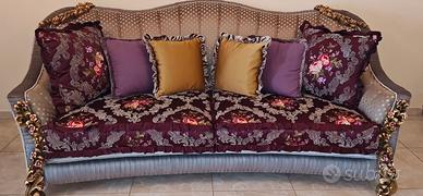Stupendo prezioso importante divano di lusso con caratteristiche che lo rendono unico, struttura in legno curvato massello con fregi floreali intagliati e dipinti a mano che lo avvolgono, finitura del legno che decora la struttura completamente avvolta da