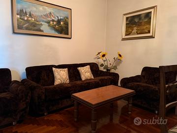 Divano di pregio color marrone con due poltrone abbinate tavolino e lampadario con decorazioni in ottone e cristallo Prezzo leggermente trattabile Vendo per svuotamento casa della nonna