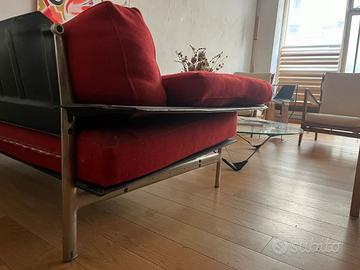 Il divano si trova in buone condizioni ed è caratterizzato da una struttura in lamiera e profilati d’acciaio con imbottitura in poliuretano sagomato rivestito in tessuto di lana e cuscini in poliuretano sagomato e piuma, che garantiscono comfort e durata nel tempo.
