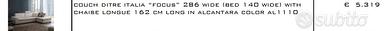 Divano usato pochissimo, trasformabile in letto con materasso di alta qualità. Realizzato in Alcantara di alta qualità, di facile manutenzione. Dimensioni: 286 cm di larghezza (letto largo 140 cm) con chaise longue lunga 162 cm.