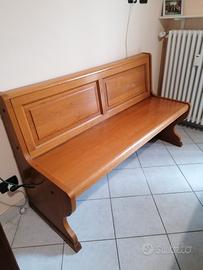 vendo cassapanca in legno, forte e robusta, con seduta apribile e due scomparti all'interno (vedi foto). noi la usavamo come divano in una piccola cucina. dimensioni: lunghezza 140cm, altezza totale 85cm, altezza della seduta 46cm, profondità seduta 38cm, profondità totale 54cm.