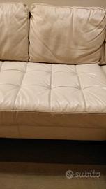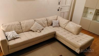 Divano in Pelle tipo Fiore colore panna. 3 Posti + chaise longue. Separabile Dimensioni 290 x 215 cm stato del rivestimento in pelle ottimo si nota solo leggero cedimento della struttura della chaise long.