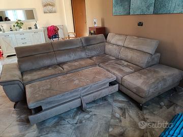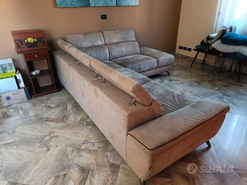 Vendo divano angolare 5 posti di colore beige con bordi marroni le sue misure sono lunghezza 278 cm larghezza 220 cm profondità 1 metro materiale alcantara, si fa anche a letto, ha 3 anni ma è in ottime condizioni. Lo vendo causa trasloco. Per info telefonare al 3471391128