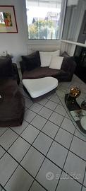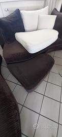 Divano di qualità a onda, con cuscini bicolore, pouf e 2 cuscini piccoli coordinati. Ottime condizioni. Tessuto scuro in velluto di cotone e tessuto bianco in cotone. Completamente sfoderabile e lavabile. Vendo causa rinnovo arredamento.