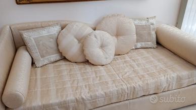 Dormeuse in tessuto con doppia rete (una estraibile) struttura in legno e metallo,completa di tappezzeria e cuscini.