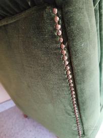 Divano dormosa in velluto verde foresta anni '70 restaurata da poco cuscini abbinati in velluto piedini originali con segni di usura oggetto vintage