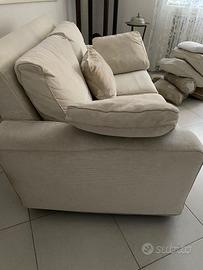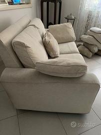 Divano due posti color crema in tessuto con cuscini , molto comodo e ben tenuto .