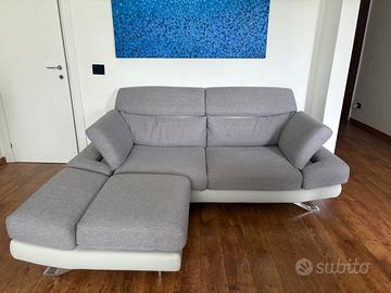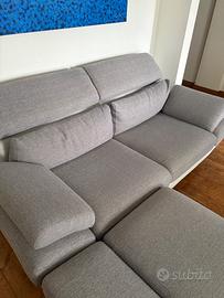 Divano due posti con pouf in tessuto grigio, rifiniture in eco pelle grigia chiara e piedini in argento cromato. Poggia testa e braccioli laterali regolabili.