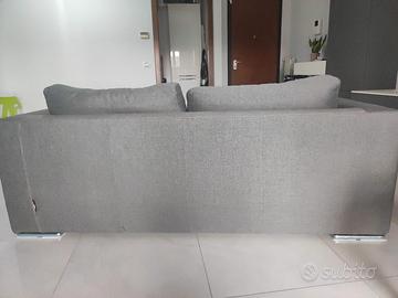 Divano grigio due posti ampi, ottime condizioni. Cuscini seduta e cuscini schienale sfoderabili. Completo di due cuscini poggia reni e due copridivano (1 grigio chiaro come in foto, 1 rosa salmone). Lunghezza 1.90 m