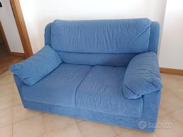 Divano due posti color celeste-blu in tessuto.