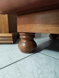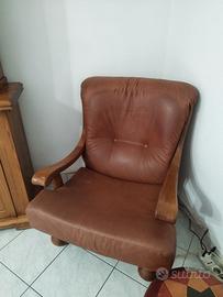 Un divano e due poltrone in pelle marrone, con bracci e piedi in legno rovere. Prezzo trattabile. Ritiro da concordare.