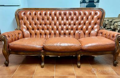 Vendo divano e poltrona capitonnè in pelle. Struttura molto solida in legno. Pelle in alcune parti della seduta un po consumata.