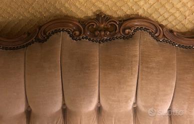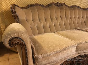 Intagli in legno. Le gambe e la cornice superiori mostrano intricate decorazioni e linee curve, che richiamano il rococò. Braccioli ricurvi e la forma generale del divano sono tipici di quello stile.