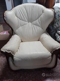 Divano e poltrona in vera pelle, con bordatura in legno effetto lucido color noce. Vendibili anche separatamente.