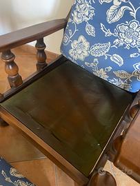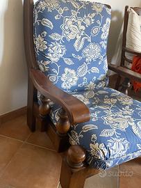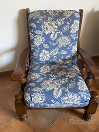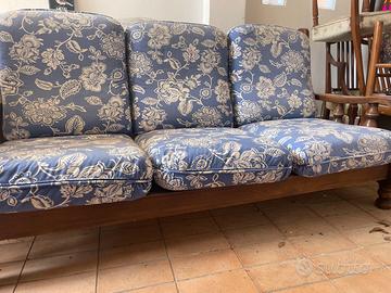 Divano e poltrona in legno con fodera floreale, tre posti, molto comodo