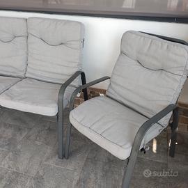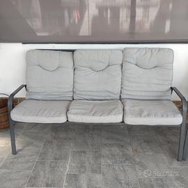 Divano e Poltrona per terrazo ,veranda o giardino ,tutto fatto in metallo in origine il davano era 2 posti ,poi l'ho convertito a 3 posti. molto comodo per trascorrere l'estate fuori in giardino,ha i suoi cuscini in tessuto. Solo a Veri interessati ,Non perdi tempo.
