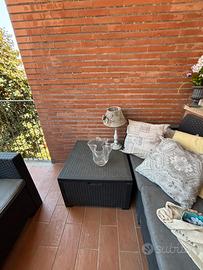 Divanetto due posti, due poltrone e tavolino contenitore in plastica per esterno.