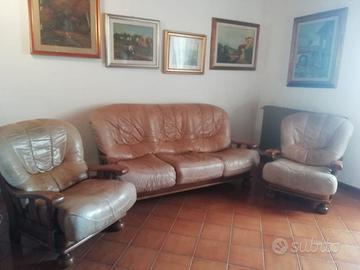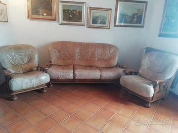 Divano tre posti con due poltrone il pelle beige, struttura e braccioli in legno usato, buono stato, prezzo 250,00 trattabili
