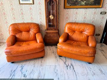 Divano e due poltrone vintage in vera pelle con targhetta. Come nuovi. Prezzo affare per sgombero appartamento. Ritiro a carico dell’acquirente.