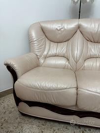 Salotto in stile classico composto da divano e sedie/poltrone girevoli, rivestiti in pelle chiara con dettagli in legno scuro. Sedute comode, struttura solida e ben conservata. Ideale per soggiorno elegante e tradizionale.