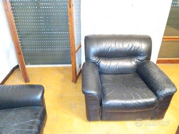Divano 2 poltrone in pelle nera. I pezzi sono venduti anche singolarmente (divano a 70,00€, ogni poltrona a 40,00€)