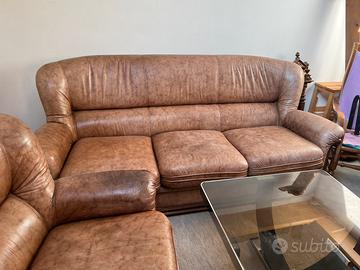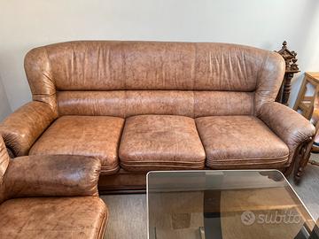 divano 3 posti e 2 poltrone in pelle Larghezza max poltrone: 90 cm Lunghezza max divano 202 cm Profondita 98 cm Segni di usura nella pelle delle sedute Terzo piano senza ascensore