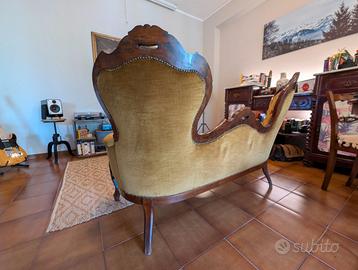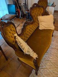 In vendita divano originale di fine '800 con due poltrone a corredo (set completo). Il tessuto, originale, non presenta alcun difetto, legni e decorazioni in ottimo stato. Il divano non è praticamente mai stato usato. Prezzo leggermente trattabile.