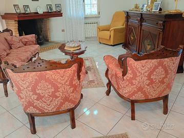 divano e 2 poltrone in stoffa damascata rosa.Sfoderabile solo i cuscini della seduta. larghezza divano 3 posti circa 180 cm,profondità circa 70 cm,altezza punto più alto circa 80cm.poltrone larghezza 85 cm circa. Struttura in legno color noce ottima,leggera usura nei braccioli delle poltrone.prezzo del divano 250,00 prezzo di ciascuna poltrona 125,00 acquistati insieme 400.