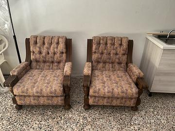 In condizioni ottime, divano e poltrone anni ‘70 ma con rivestimento nuovo. Tessuto damascato e struttura in legno. Divano 190 cm circa di larghezza, poltrone 80cm circa, altezza entrambi 90cm altezza e circa 100cm profondità.