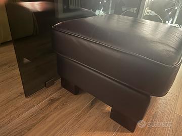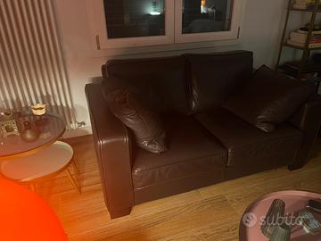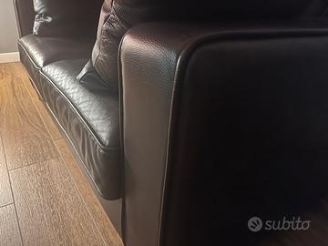 Divano due posti in pelle pieno fiore color marrone bruno in condizioni perfette, completo di due grandi cuscini, con interno in piuma d’oca, e due comodi pouf in tinta. Piedini in legno wengé. Il divano di dimensioni compatte, misura 95 di profondittà, 80 di altezza, 160 di lunghezza. Adatto a diversi ambienti della zona giorno, a studi, a piccoli soggiorni. I cuscini misurano 45x45, e sono in pelle anch’essi. I pouf i55x55 sono sempre della stessa pelle pregiata e i piedini della medesima qualità e dimensione di quelli del divano. Le strutture interne integre. Sia il divano, ma anche i pouf, sono rifiniti integralmente con bordino in tinta impuntato, sinonimo di manifattura pregiata. Non ci sono graffi, macchie, aloni, punti in cui risulta usurato. Sono perfetti. Usati pochissimo. Sono pari al nuovo. Prodotti dalla famiglia Natuzzi, la generazione della prima ora: un nome e una garanzia del design Made in Italy.