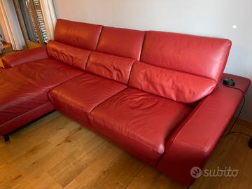 Usato ma in condizioni più che ottime, pelle di altissima qualità, poggiatesta reclinabili. Tre posti spaziosi con Chaise Longue destra) ingombro 274 cm. colore rosso - modello BOOMER