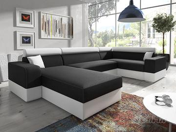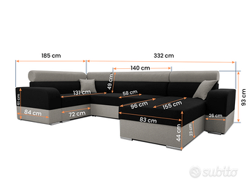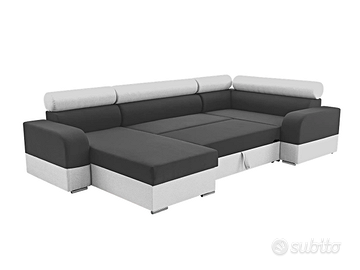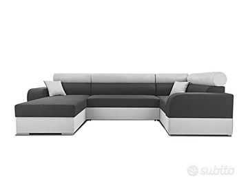 Cerchi un divano panoramico dalla struttura robusta ed affidabile? I nostri divani, prodotti da aziende competenti e specializzate, sono pezzi realizzati ad hoc per soddisfare i tuoi gusti più personali. Questo divano angolare ad U è realizzato con materiali di prima qualità ed è costruito per resistere. La sua struttura è solida e i rivestimenti di alta qualità ne assicurano una resistenza eccezionale all’usura. Personalizzalo con il colore che preferisci e goditi il comfort di un divano creato su misura. Prodotto esclusivo, creato apposta per te. Sottolineiamo che il rivestimento della funzione letto che fuoriesce può essere di colore diverso da quello evidenziato in foto e comunque non è in tinta ed è differente dalla combinazione di colore del divano che si sceglie. Misure: lunghezza 332 cm – altezza 93 cm – profondità 185/185 cm – dimensione letto 278×132 cm Perché il divano Toronto è così speciale? Materiali robusti e di qualità: anima in legno massello e imbottitura in schiuma di poliuretano ad alta resilienza dalla densità di 40 kg/m3. Piedi in metallo. Cinghie di sostegno in ferro per sostenere il peso e le sollecitazioni con maggiore resistenza Funzione letto: si trasforma in un letto con un semplice gesto, con meccanismo di apertura DELFIN, offrendo una soluzione pratica per ogni evenienza Box contenitore: dotato di ben 2 comodi spazi contenitore posti sotto le penisole, ideali per riporre coperte, cuscini, biancheria da letto o altri oggetti Posti: per 5 persone, offre spazio sufficiente per tutta la famiglia e gli amici Design: presenta linee pulite e un design minimalista, tipico dello stile moderno, con poggiatesta Versatilità: la configurazione angolare offre ampio spazio per sedersi e rilassarsi, mentre la chaise longue aggiunge un tocco di comfort extra Rivestimento: morbido tessuto resistente all’usura.