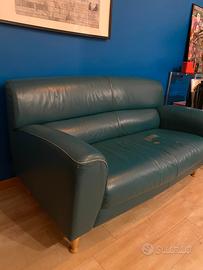 Divano Frau, due posti, color petrolio Dimensioni: Lunghezza 155 Profondità seduta 51 Profondità con schienale 87 Altezza 85 Rovinato sulla seduta di sinistra, fornisco fodera dello stesso colore NON SPEDISCO