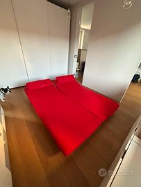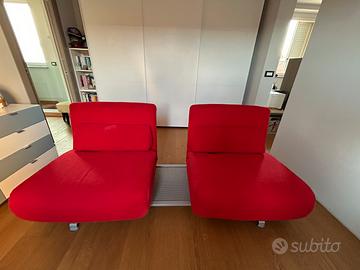 Divano composto da due poltrone girevoli a 360gradi. Se distanziate (scorrono verso l’esterno) in mezzo si ottiene un tavolino. Si possono ottenere svariate configurazioni. Le poltrone si possono trasformare in chais longue o letti (insieme o singolarmente). Per visionare le molteplici configurazioni consigli di cercare online il divano e le schede tecniche.