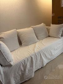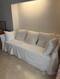 Gervasoni Mod. Ghost 10 G Ghost, un divano che si sviluppa attorno ad una leggera scocca dai volumi essenziali. Realizzato da una struttura minimale e sottile imbottita in poliuretano espanso, Ghost contiene soffici cuscini volanti in misto piuma. La caratteristica principale dei divani Ghost è il rivestimento sfoderabile, una housse oversize il cui profilo è sottolineato dalle cuciture a vista, che permette ai prodotti di svestirsi e rivestirsi in un baleno. Si tratta di un progetto tessile che cambia facilmente volto, permettendo di passare da un look formale ad uno informale con facilità e velocità. Divano, imbottitura in poliuretano espanso. Rivestimento sfoderabile. Cuscini volanti in misto piuma, due 50x50 cm e tre 60x60 cm. Divano Materiale: Poliuretano espanso - Tessuto Rivestimento: Lino Bianco cat.B Dimensioni: L 200 x P 85 x H 80 cm - Seduta 42 cm Consegna immediata Prezzo listino 3410€
