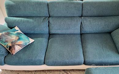 Vendo bellissimo divano marca Poltronesofà, modello Gimigliano, in tessuto color ottanio (interamente sfoderabile) e base in similpelle bianca. Corredato da pouf e cuscini. Piedi cromati. Misure divano: cm 252x115x93 Misure pouf: cm 72x98x44