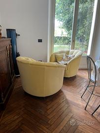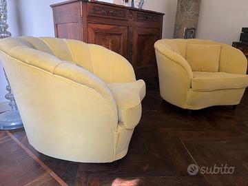 Salotto Divano e poltrone disegnato da Gio Ponti ponti per Casa e Giardino negli anni ‘30 Rifoderato recentemente con velluto 100% Cotone giallo. Molti metri di tessuto nuovo vengono inseriti nel prezzo per eventuali future riparazioni. Sempre tenuto coperto. Le sedute e i quattro cuscini sono sfoderabili. La Se ci accordiamo posso porrare io il divano. Scrivere per altre specifiche. Whatsapp disponibile.