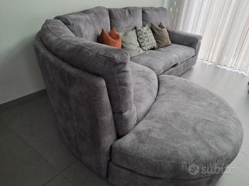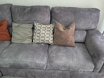 Divano angolare grigio in tessuto antimacchia e idrorepellente acquistato nel 2016 e in buone condizioni, sfoderabile e lavabile in lavatrice a 30°. Presentanta lievi segni di usura, quali cucitura di microlacerazione e le cerniere tra intelaiatura e cuscini da sistemare, sebbene questo non pregiudichi la funzionalità dell'oggetto da arredo né l'estetica. Molto comodo ed avvolgente.