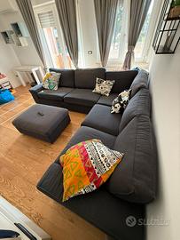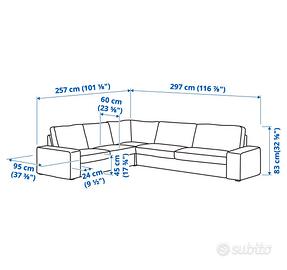 Vendo divano Ikea kivik angolare 5 posti (3+2), misure 297x257. Completamente sfoderabile. Venduto in buono stato, non presenta rotture strutturali ma solo segni di usura (dovuti al normale utilizzo) nel rivestimento, eventualmente acquistabile presso Ikea al costo di circa 170€. Venduto insieme a 2 cucini di ricambio da seduta per lato corto e pouf contenitore. I 2 cucini schienale del lato lungo sono stati cambiati da pochi mesi. Nota: nell’immagine con le misure la posizione del lato corto e lungo è invertita rispetto alla disposizione dell’articolo venduto.