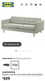 Divano Ikea 3 posti, modello Landskrona, colore verde menta. Piedini in legno, cuscini removibili. Comodissimo! Condizioni ottime. Anno d’acquisto 2023.