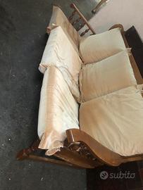 Regalo divano 3 posti, di legno con cuscini appena tapezzati in velluto color cipria. Ha qualche graffio sul bracciolo che può essere facilmente coperto dalla cera per legno. struttura solidissima. Svendo per rinnovo arredamento. Ritiro presso il mio domicilio.